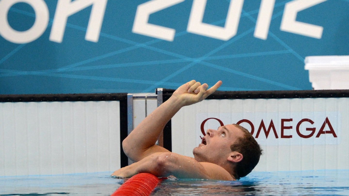 American swimmer Tyler Clary celebrates winning gold in the men’s 200m backstroke final at the London 2012 Olympic Games on August 2, 2012 in London. (CHRISTOPHE SIMON/AFP)
