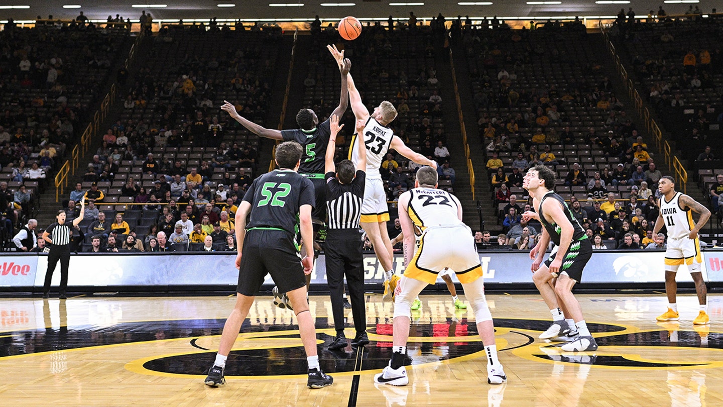 November 7, 2023; Iowa City, Iowa, USA; North Dakota is fighting for Hawks forward Deng Mayar (5) and Iowa Hawkey’s tips Ben Krick (23) Fight for Opening Tip Poffee during the first half of the Carver-Hawkeye Arena. (Jeffrey Becker/USA Today Sports)