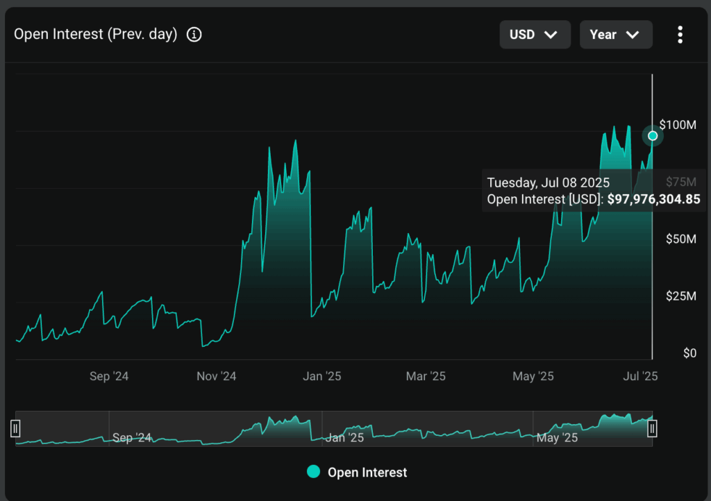 The so -called nominal open interest (Oi) has risen to nearly $ 98 million from $ 71 million since the 27th of June quarterly expiry, a solid 38% increase in two weeks. It is now approaching June 24 -record of $ 102.3 million, according to data source -derived measurements. In contract terms, OI has increased by 26% to 42,414. (Contract Multiplier for XRP on Deribit is 1,000 XRP).