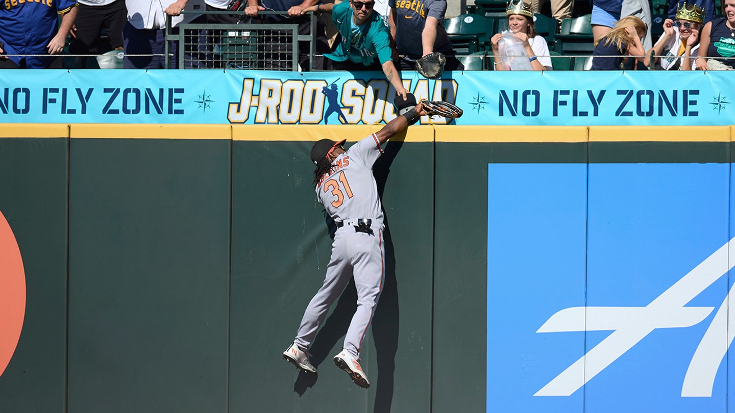 Mullin scaled the midfield wall to give him a few extra feet with stretch, then went up and got the ball with his glove and snapped it from a fans’ reach.