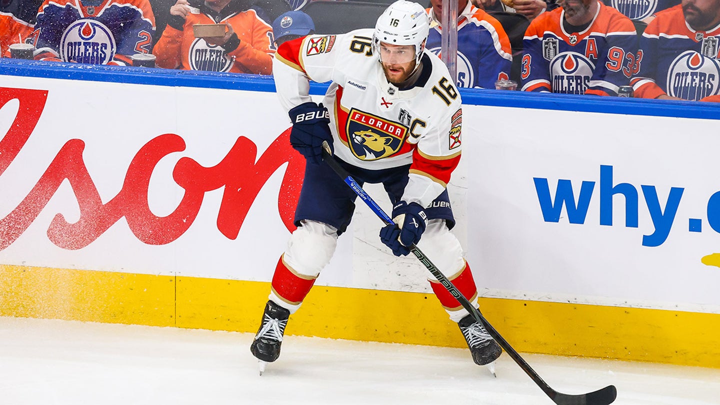 Florida Panthers Center Aleksander Barkov, #16, controls the puck against Edmonton Oilers in the second period in match five of the 2025 Stanley Cup final at Rogers Place. (Sergei Belski-Pre-Preferred Pictures)