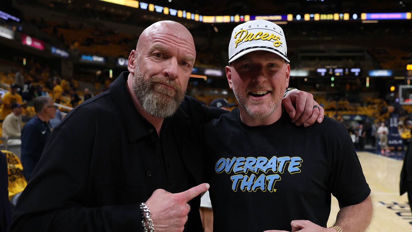 Paul Michael Levesque, known professionally as Triple H, and Pat McAfee make up for a photo before the game four of the eastern conference final between Indiana Pacers and New York Knicks for 2025 NBA playing games at Gainbridge Fieldhouse. (Trevor Ruszkowski-Published Pictures)