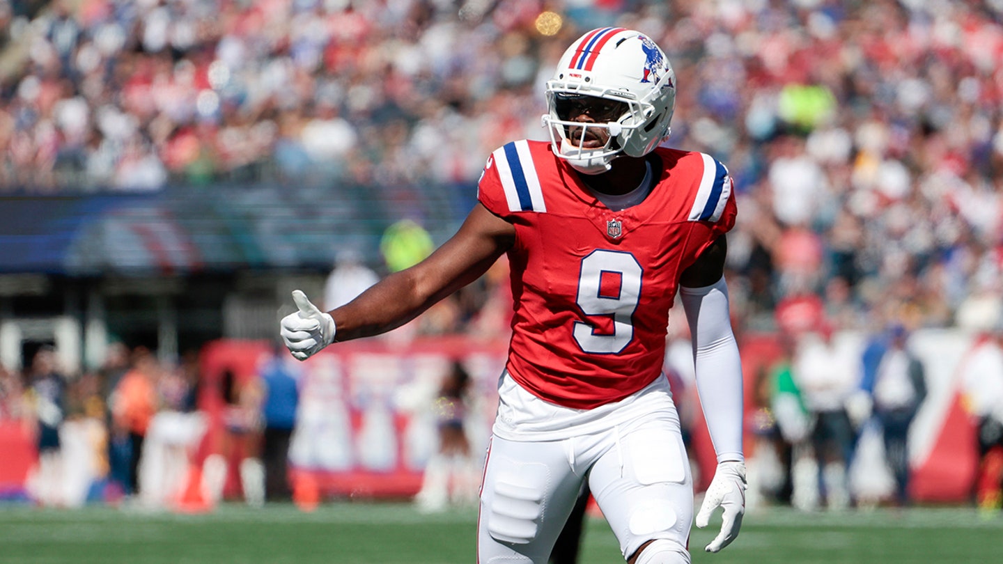 Kayshon Boutte of the New England Patriots makes sure he is onside during a game between the New England Patriots and the Pittsburgh Steelers on September 21, 2025 at Gillette Stadium in Foxborough, Massachusetts. (Kfoury III/Icon Sportswire via Getty Images)