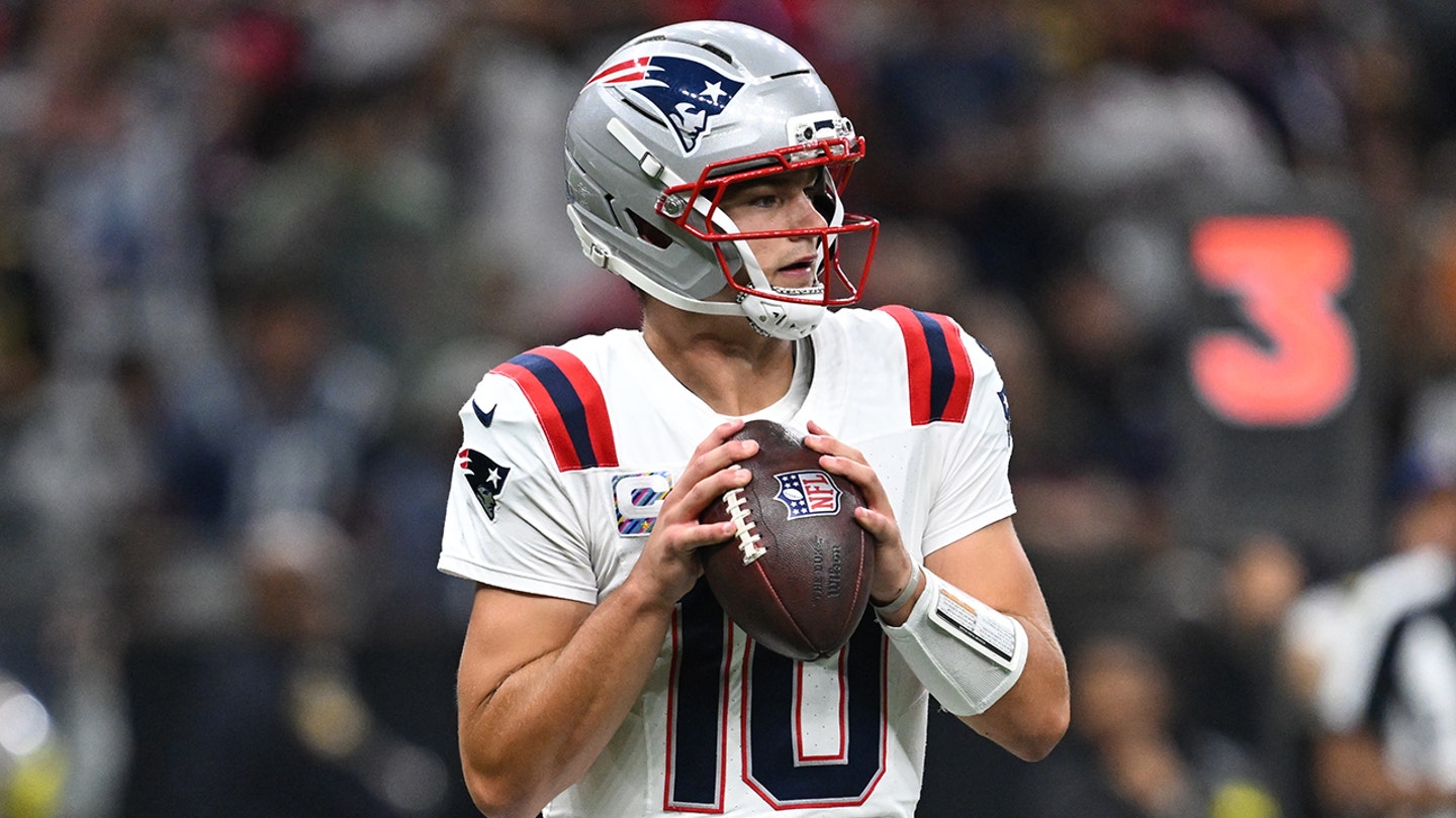 New England Patriots Quarterback Drake Maye seems to be throwing during the second half of a NFL football match against New Orleans Saints, Sunday October 12, 2025, in New Orleans. (AP Photo/Ella Hall)