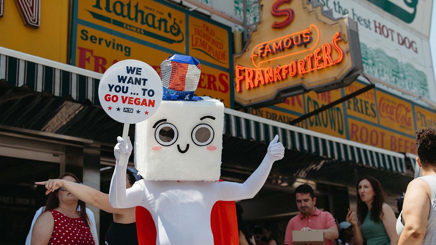 Tommy Tofu stands in front of Nathan’s. (Peta)