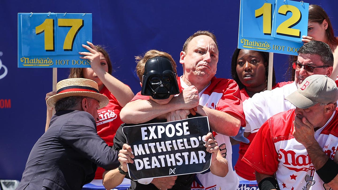 Chestnut has actually dealt with a protest during the competition before. About halfway through the 2022 event, protesters rushed the scene – at least one wearing a darth wader -mask – while wearing signs reading “Expose Smithfield Deathstar.” Smithfield is a large food processing company from Smithfield, Virginia, which specializes in pork products. Nathan’s famous is an all-beef Frank.