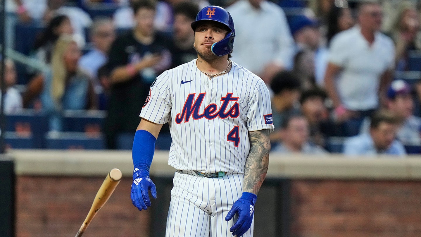 The New York Mets Catcher Francisco Alvarez, #4, throws his bat after hit a two-run home drive during the second round of a baseball match against Atlanta on Tuesday, August 12, 2025 in New York. (AP Photo/Frank Franklin II)