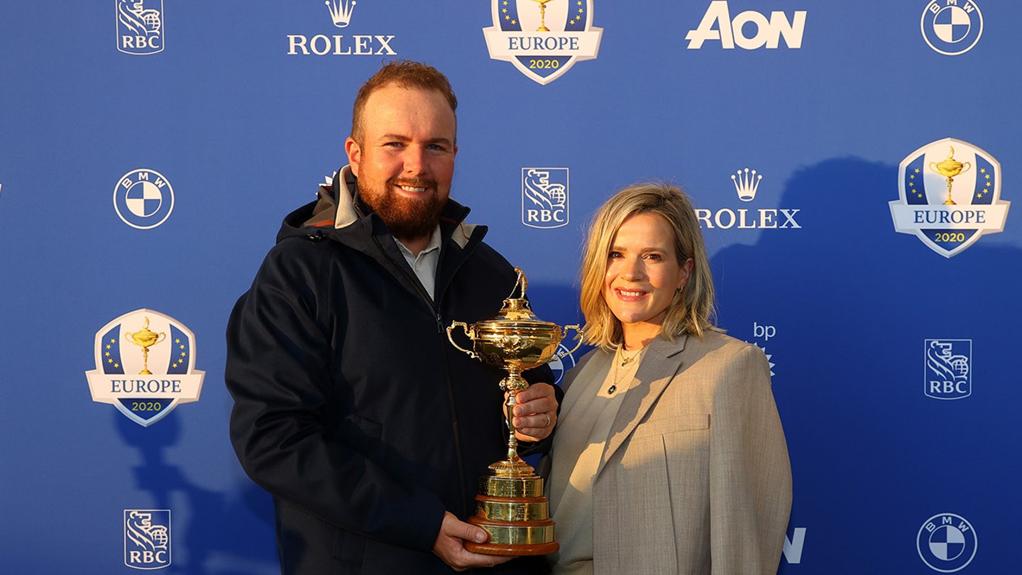 Shane Lowry from Team Europe and wife Wendy Lowry is with the Ryder Cup Trophy before giving Heathrow Airport in front of the 43rd Ryder Cup on September 20, 2021 in London. (Andrew Redington/Getty Images)
