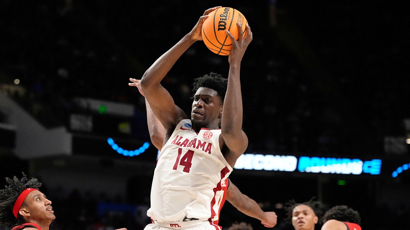 Alabama center Charles Bediako (14) pulls in a rebound while guarded by Maryland guard Ian Martinez, left, during the second half of a second-round college basketball game in the men’s NCAA Tournament. The game was played in Birmingham, Alabama on March 18, 2023. (Rogelio V. Solis/AP Photo, File)