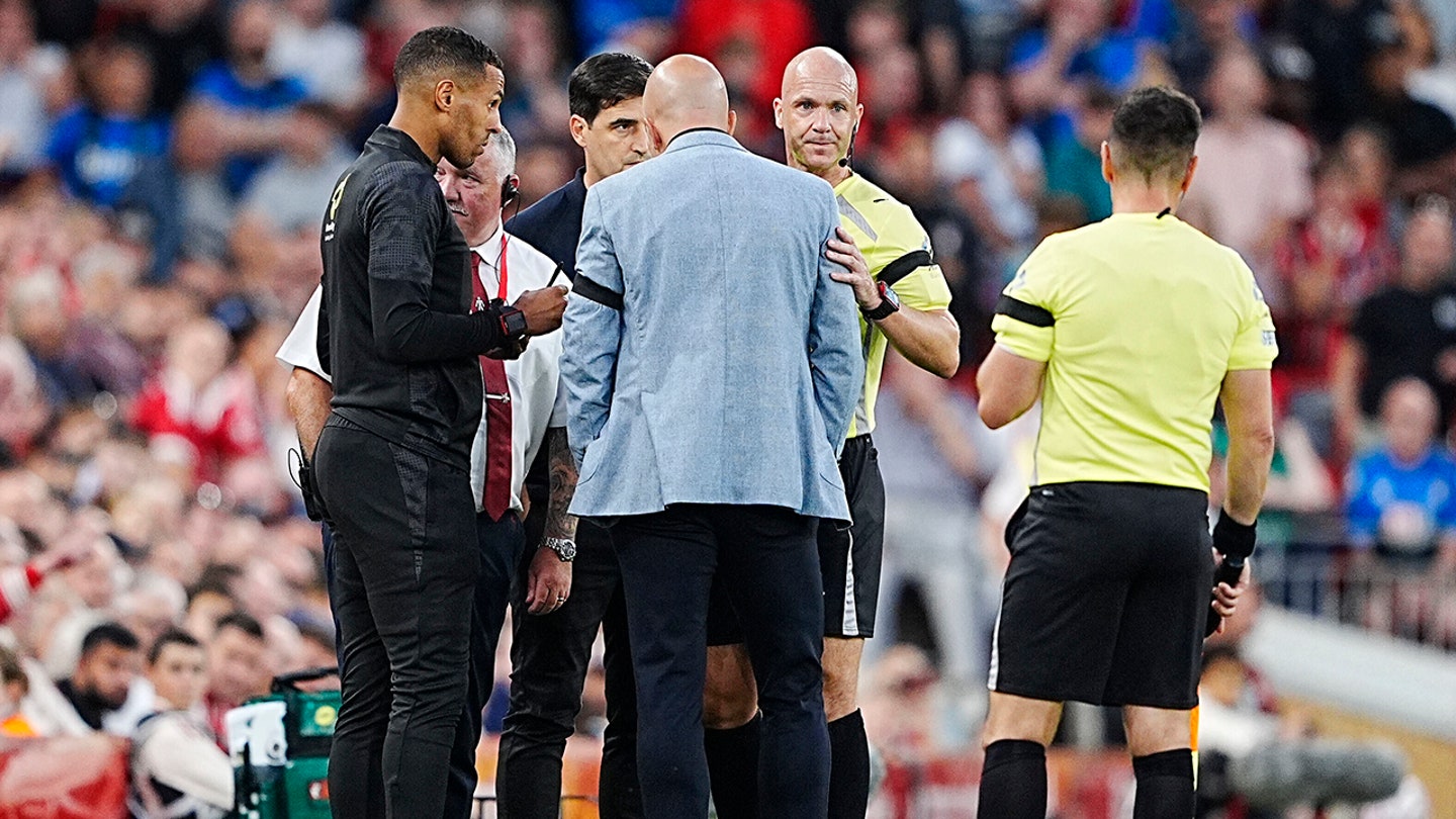 Judge Anthony Taylor talks to Liverpool -Manager Arne Slot and Bournemouth -Manager Andoni Iraola after Bournemouth’s Antoine Semenyo, not depicted, informed the judge of a possible racial comment from the crowd under an English Premier League in Anfield, Liverpool, England, Friday 15 August, 2025. (Peter Byrne/Pa via AP)