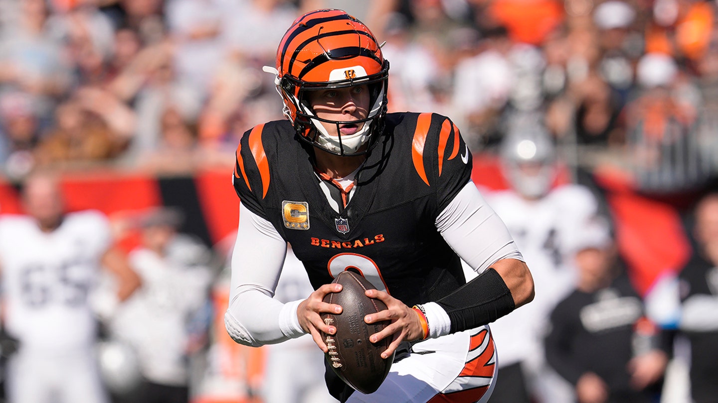Cincinnati Bengals quarterback Joe Burrow rolls out to pass against the Las Vegas Raiders during the first half of an NFL football game in Cincinnati, Sunday, Nov. 3, 2024. (AP Photo/Jeff Dean)
