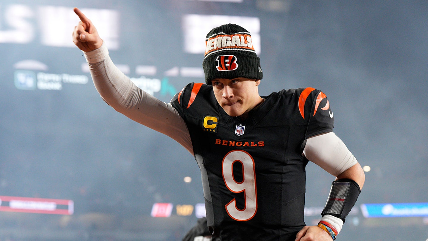 Cincinnati Bengals quarterback Joe Burrow (9) celebrates after an NFL football game against the Denver Broncos in Cincinnati, Saturday, Dec. 28, 2024. (AP Photo/Jeff Dean)