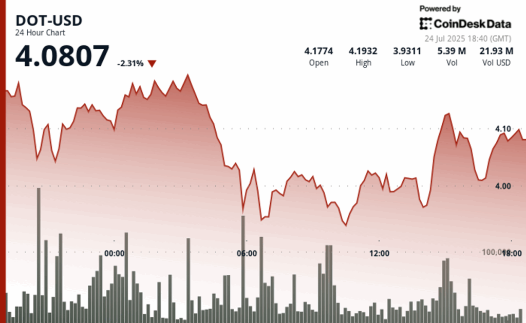 The model showed that DOT navigated significant price fluctuations during the 24-hour period from July 23, 19:00 to July 24, 18:00, which fluctuates between $ 3.91 and $ 4.20 before settling at $ 4.08.