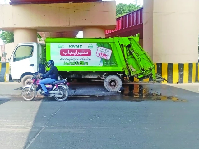 A vehicle belonging to the Rawalpindi Waste Management Company (RWMC) has been found parked on a main road. The vehicle leaks oil, spews foul-smelling sewage and carries waste beyond its rated capacity. Photo: EXPRESS