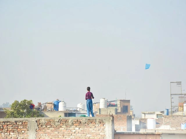 A boy flies a kite from the roof of his house in Rawalpindi, maneuvering it against the clear blue sky as the afternoon sun casts long shadows. Photo: ONLINE
