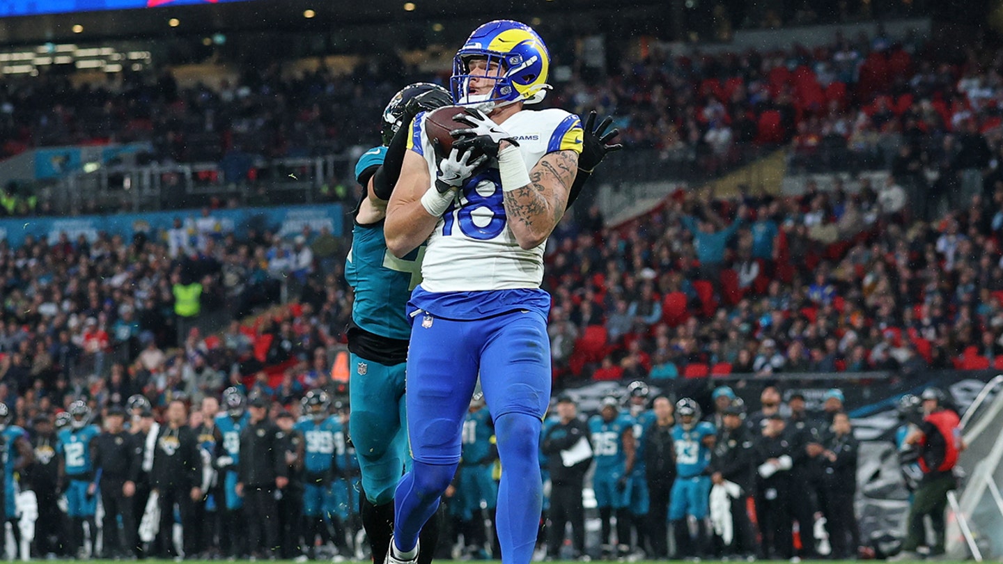 Los Angeles Rams tight end Terrance Ferguson (18) scores a touchdown during the second half of an NFL football game between the Los Angeles Rams and the Jacksonville Jaguars in London, Sunday, Oct. 19, 2025. (AP Photo/Ian Walton)