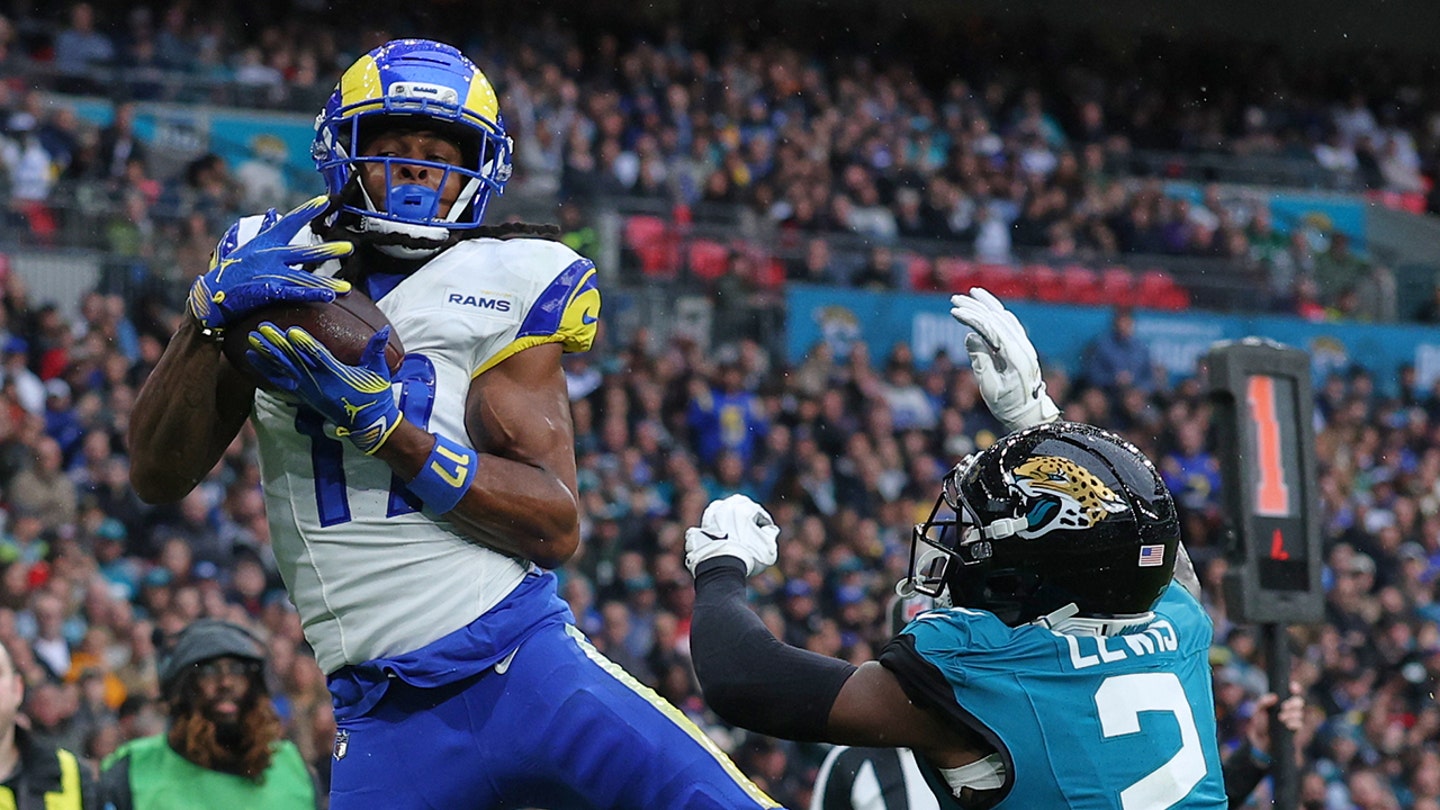 Los Angeles Rams wide receiver Davante Adams (17) scores a touchdown during the first half of an NFL football game between the Los Angeles Rams and the Jacksonville Jaguars in London, Sunday, Oct. 19, 2025. (AP Photo/Ian Walton)