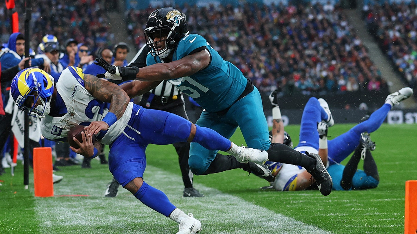 Jacksonville Jaguars linebacker Ventrell Miller (51) pushes Los Angeles Rams running back Kyren Williams (23) into contact during the first half of an NFL football game between the Los Angeles Rams and the Jacksonville Jaguars in London, Sunday, Oct. 19, 2025. (AP Photo/Ian Walton)