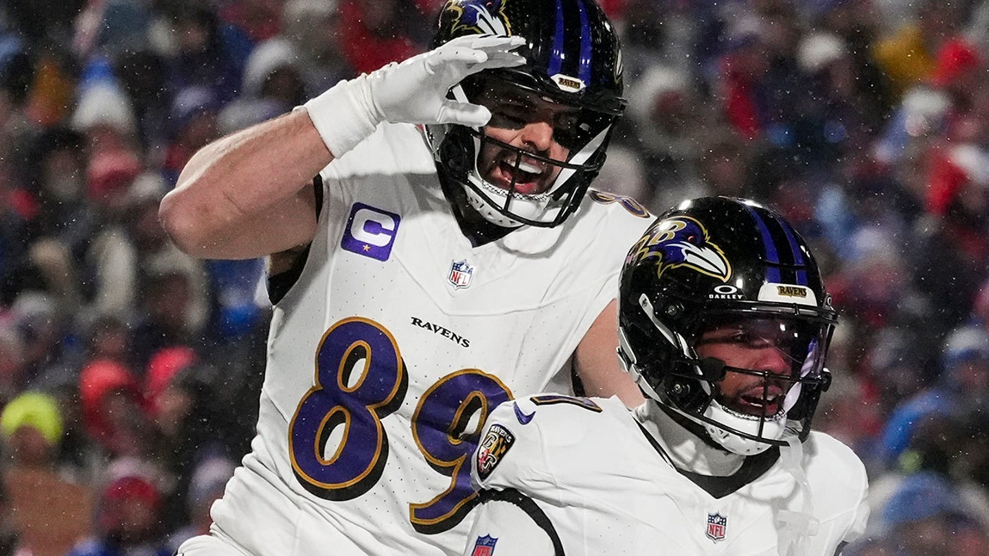 January 19, 2025; Orchard Park, New York: Baltimore Ravens tight end Mark Andrews (89) drops a pass on a two-point conversion late in the fourth quarter against the Buffalo Bills in a 2025 AFC divisional round game at Highmark Stadium. (Gregory Fisher-Imagn Photos)
