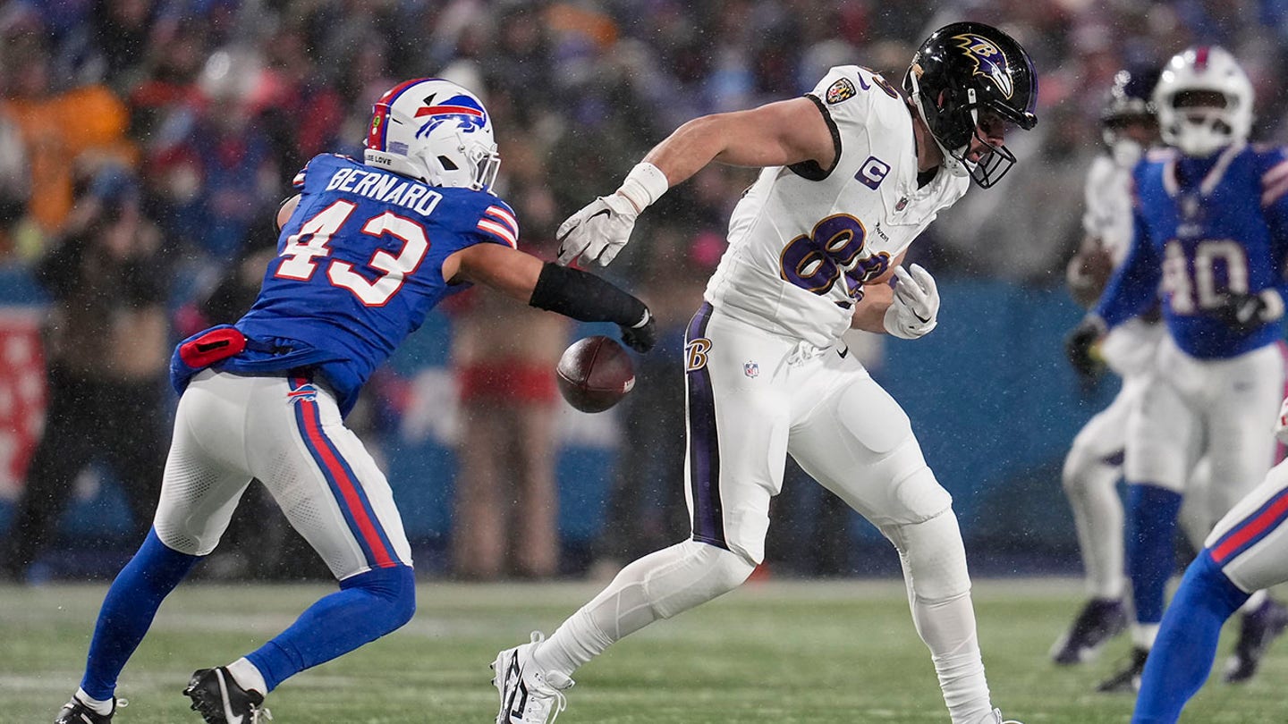 Buffalo Bills linebacker Terrel Bernard (43) strips the ball from Baltimore Ravens tight end Mark Andrews (89) during the fourth quarter of an NFL divisional playoff football game Sunday, Jan. 19, 2025, in Orchard Park, NY (AP Photo/Gene J. Puskar)