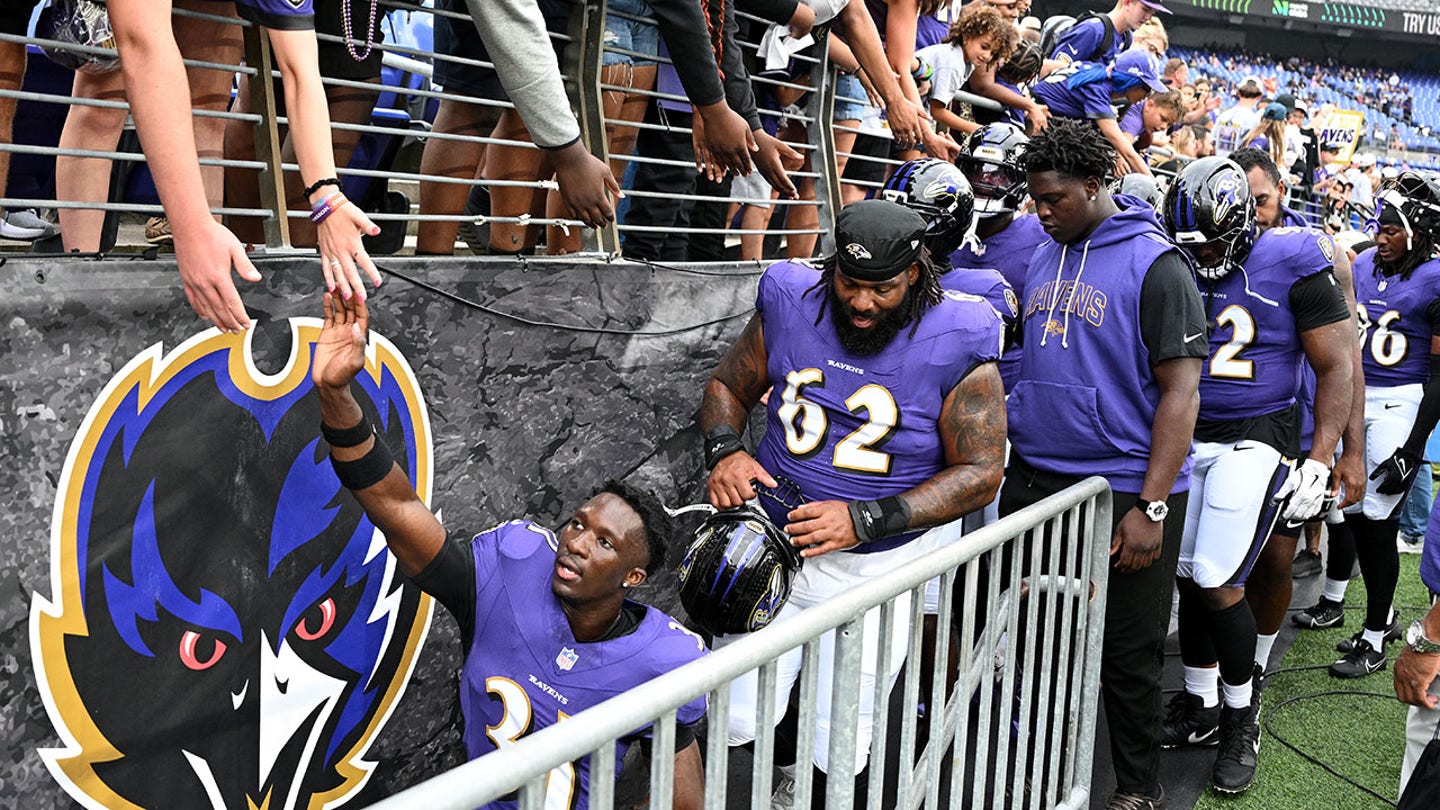 The Baltimore Ravens walk into the locker room before the game against the Indianapolis Colts during the NFL Preseason 2025 game at M&T Bank Stadium on August 7, 2025 in Baltimore, Maryland. (G Fiume/Getty Images)