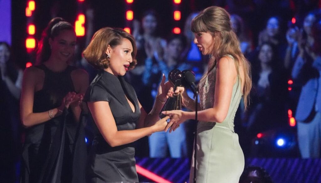 Taylor Swift gave some advice and some secrets to RAYE, who presented her with an award at the iHeartRadio Music Awards on Thursday, March 26.