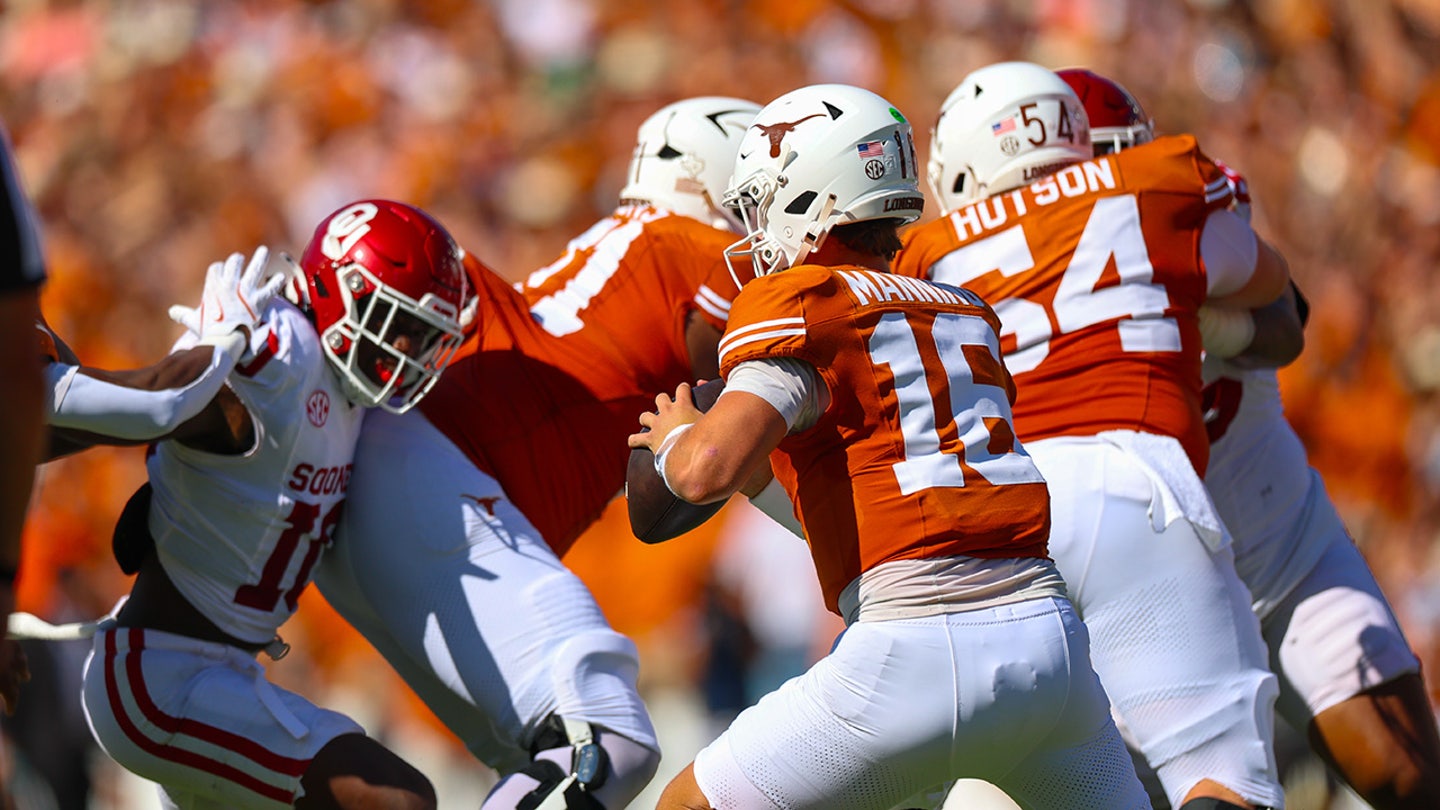 Texas Longhorn’s Quarterback Arch Manning (16) seems to be throwing when Oklahoma Soners Linebacker Kip Lewis (10) defends during the first quarter of Cotton Bowl on October 11, 2025 in Dallas, Texas. (Kevin Jairaj/Imag- Pictures)