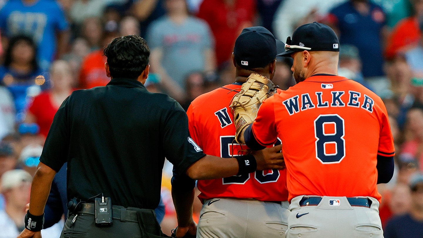 Houston Astros Relief Pitcher Hector Neris is detained by the first Baseman Christian Walker on August 2, 2025. (Barry Chin/The Boston Globe via Getty Images)