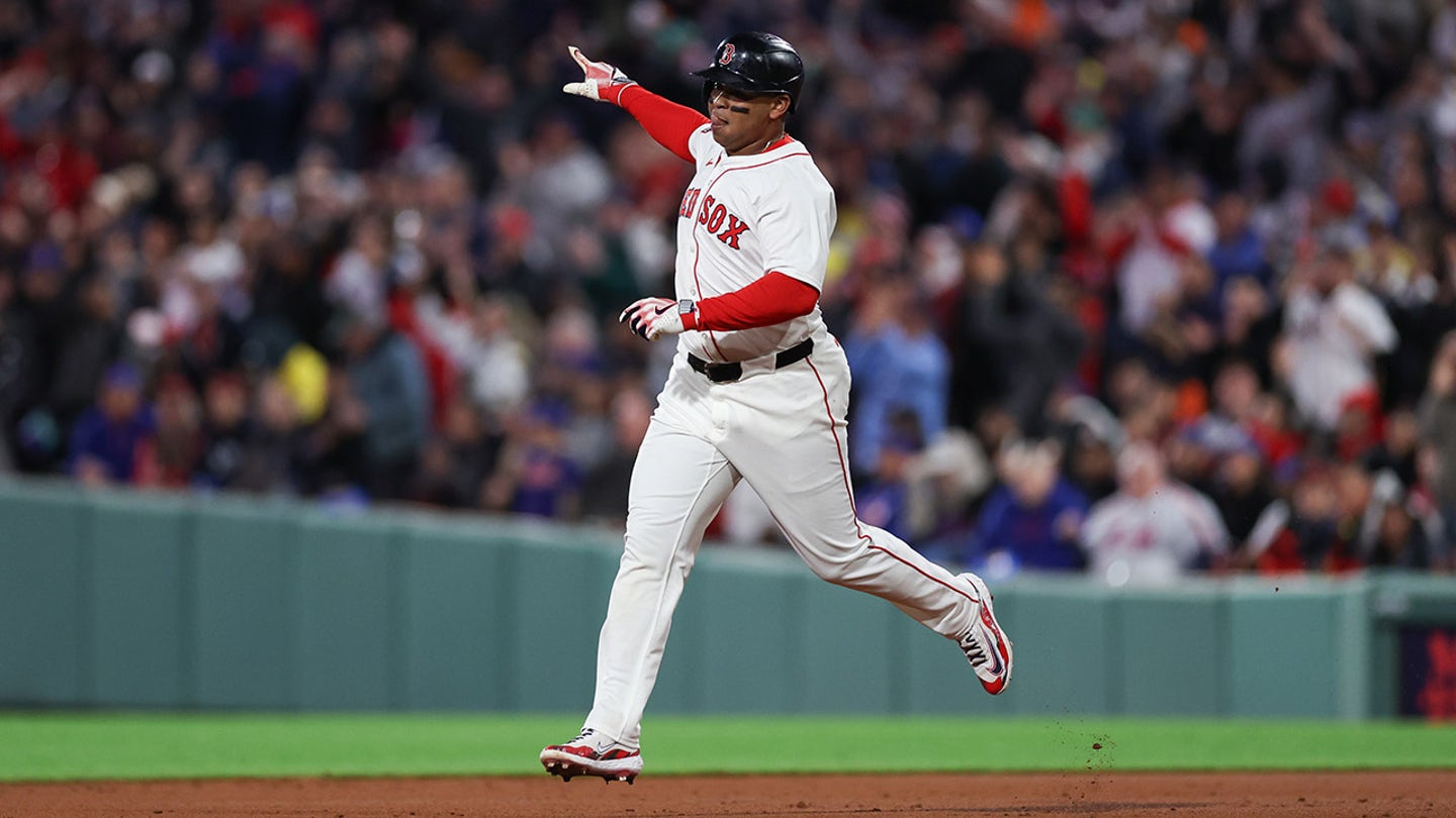 Boston Red Sox appointed hitter Rafael Devers, #11, hits a solo home run during the fifth round against the New York Mets at Fenway Park in Boston on May 20, 2025. (Paul Rutherford-Preferred Pictures)