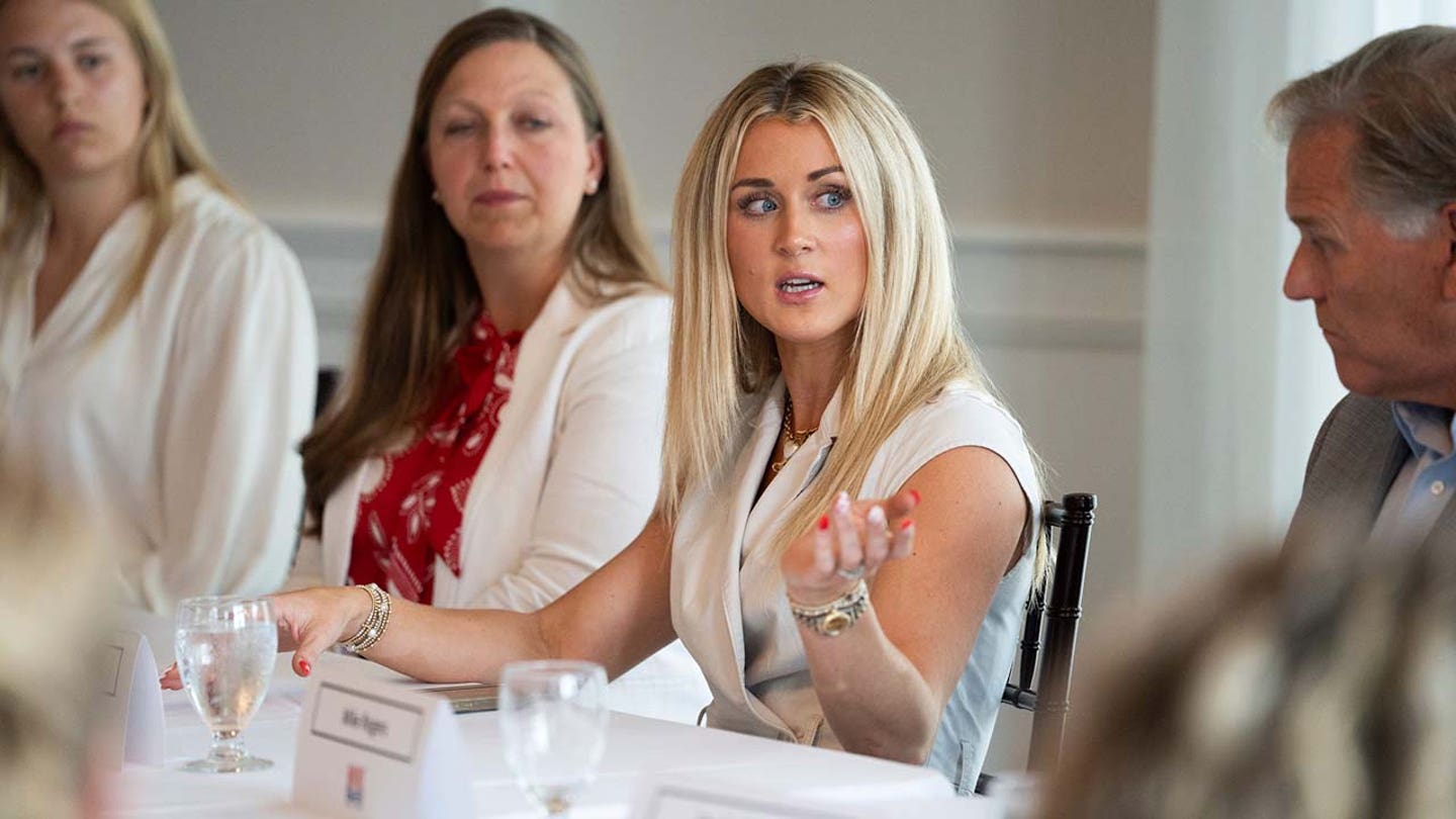 Riley Gaines, Center, Movements, while talking to a panel during a roundtable event calling to protect Women’s Sports at Captain’s Club Golf & Event Center in Grand Blanc 5 August 2024. (Ryan Garza/USA Today Network)