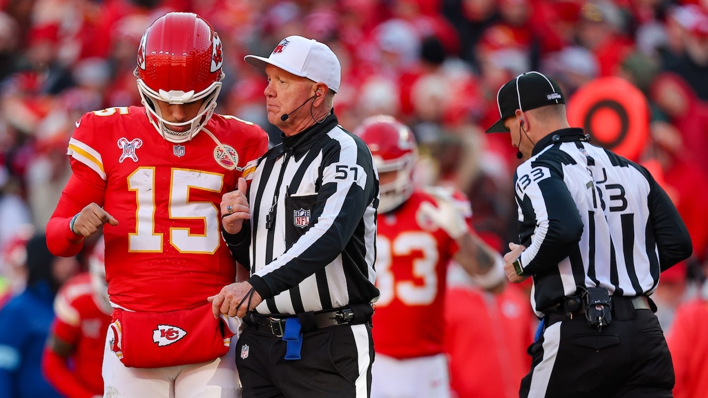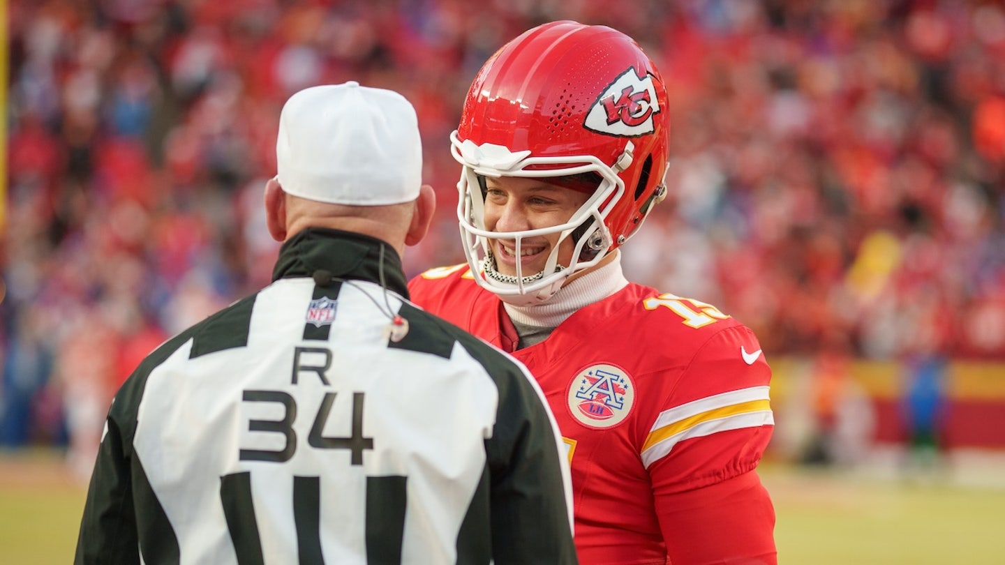 Chiefs Quarterback Patrick Mahomes talks with Judge Clete Blakeman ahead of the AFC championship against Buffalo Bills on January 26, 2025 in Kansas City, Mo. (Todd Rosenberg/Getty Images)