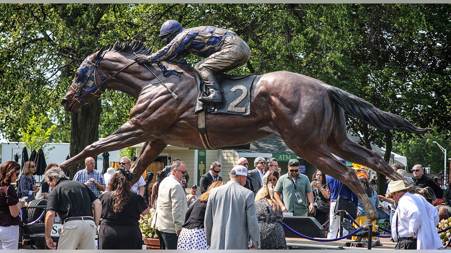 People gather around a huge statue of the Secretariat in Belmont Park in 2023 as they celebrate the 50th anniversary of the Secretariat at Belmont Stakes in Elmont, New (Thomas A. Ferrara/Newsday RM via Getty Images)
