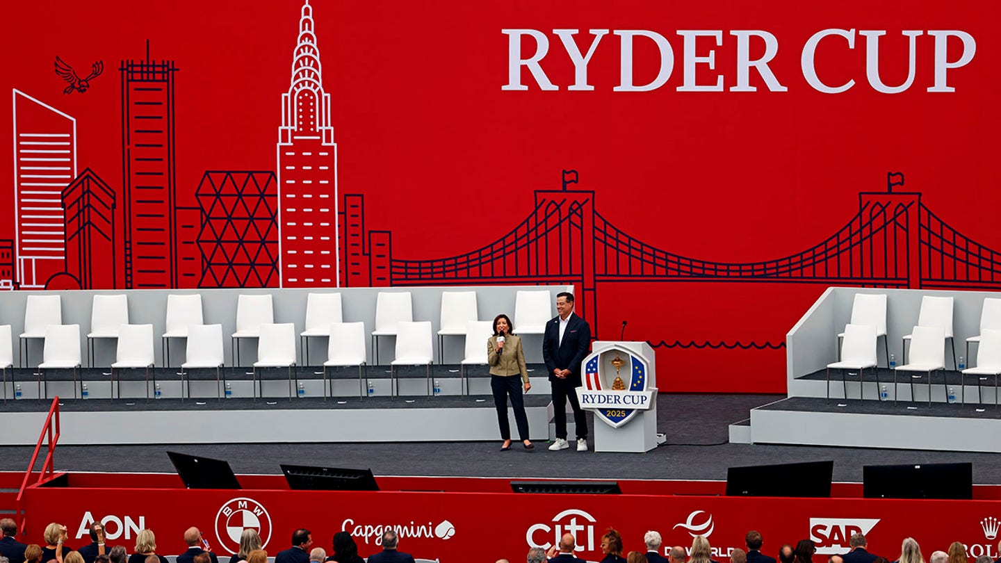 Kathy Hochul, Governor of New York and Carson Daly speak to the crowd during the opening ceremony for the 2025 Ryder Cup on Black Course at Bethpage State Park Golf Course on September 24, 2025 in Farmingdale, New York. (Harry How/Getty Images)