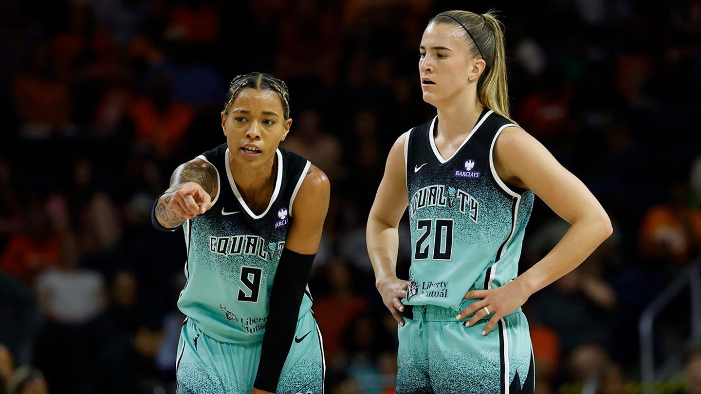 June 5, 2025; Washington, DC New York Liberty Guard Natasha Cloud (9) talks with Liberty Guard Sabrina Ionescu (20) against Washington Mystics in the first half at Entertainment & Sports Arena. (GEOFF BURKE-FORIVED PICTURES)