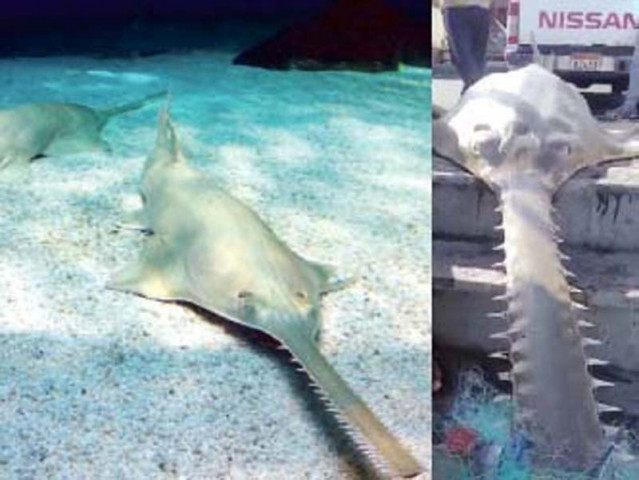 The sawfish, a unique member of the shark family, is easily recognizable by its long, saw-like snout lined with 20 to 30 sharp teeth. It can weigh up to 600 kg and was once commonly found in the Arabian Sea, Persian Gulf and coastal areas of Pakistan, especially Karachi, Pasni, Ormara and Jiwani.