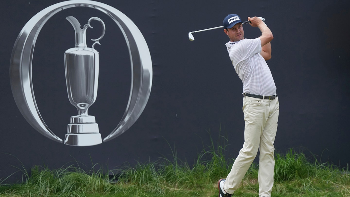 Harris English from the United States plays his tee shot on the 1st. During the third round of the British Open Golf Championship at Royal Portrush Golf Club, Northern Ireland, Saturday 19 July 2025. (AP Photo/Jon Super)