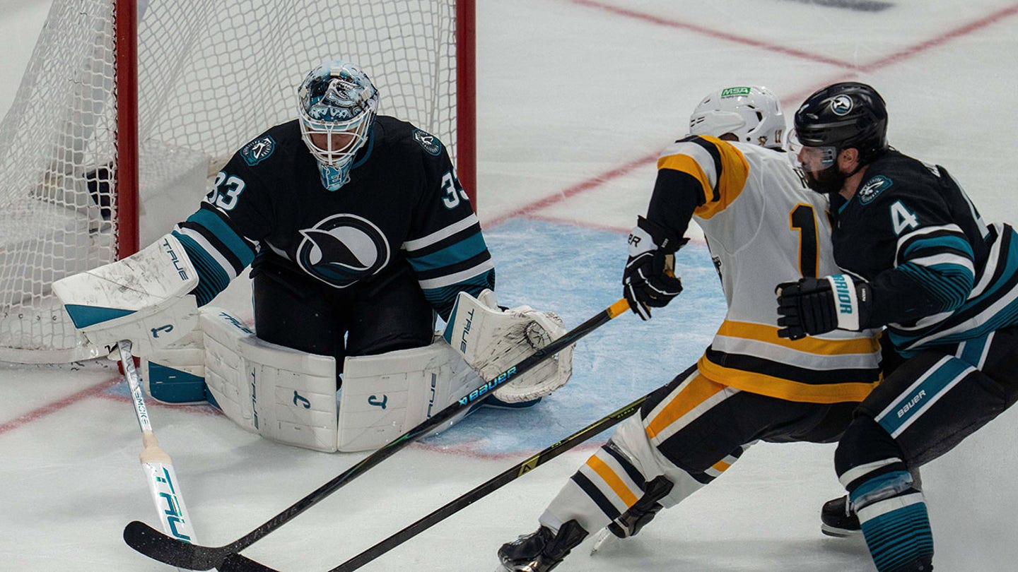 San Jose Sharks goalie Alex Nedeljkovic (33) makes a save against Pittsburgh Penguins right wing Bryan Rust (17) while being defended by San Jose Sharks defenseman Nick Leddy (4) during the third period at the SAP Center in San Jose on Oct. 18, 2025. (Neville E. Guard/Imagn Images)