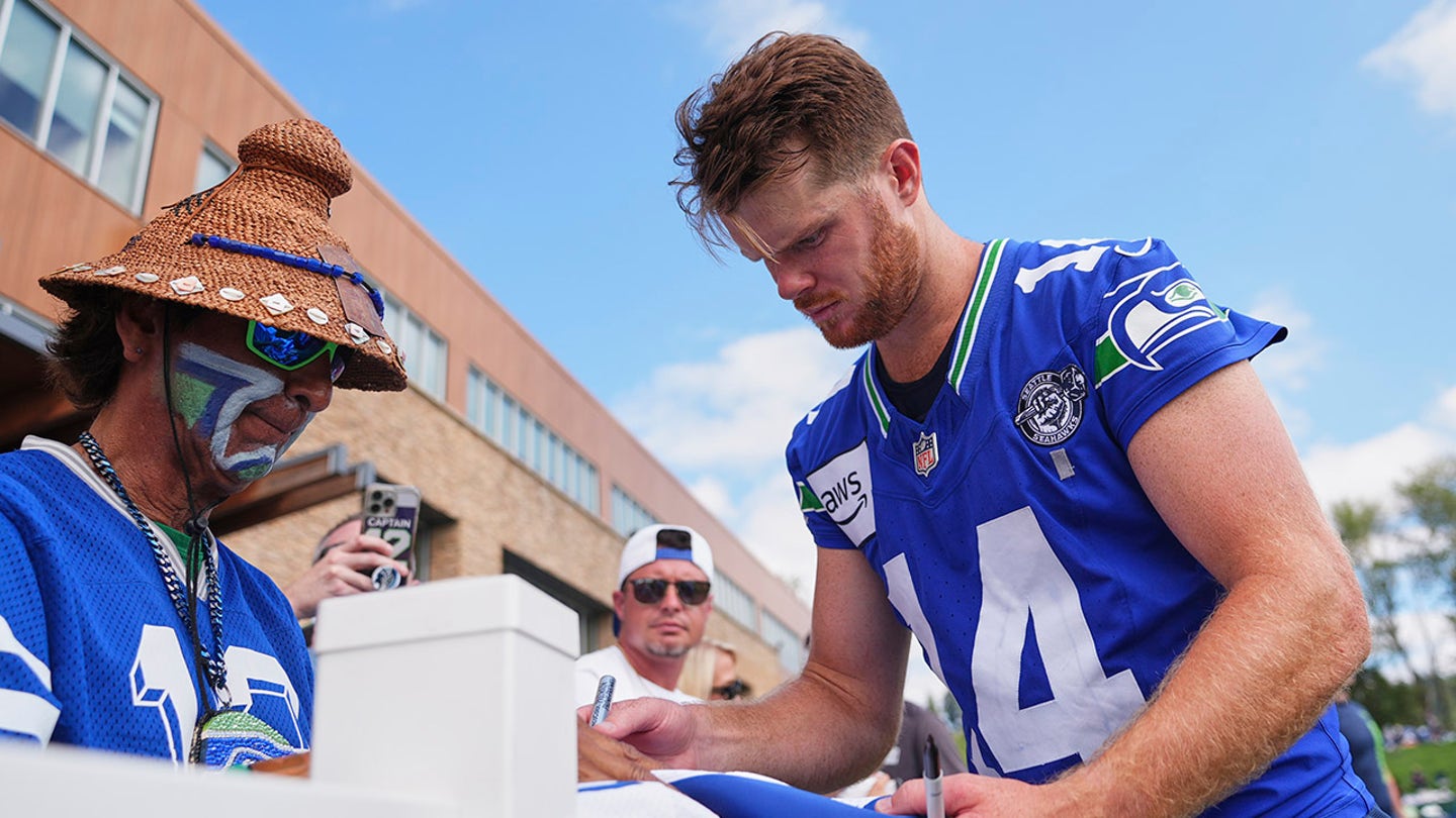 Seattle Seahawks Quarterback Sam Darnold signs autographs to fans during training camp on July 25, 2025, in Renton, Wash. (AP Photo/Lindsey Wasson)