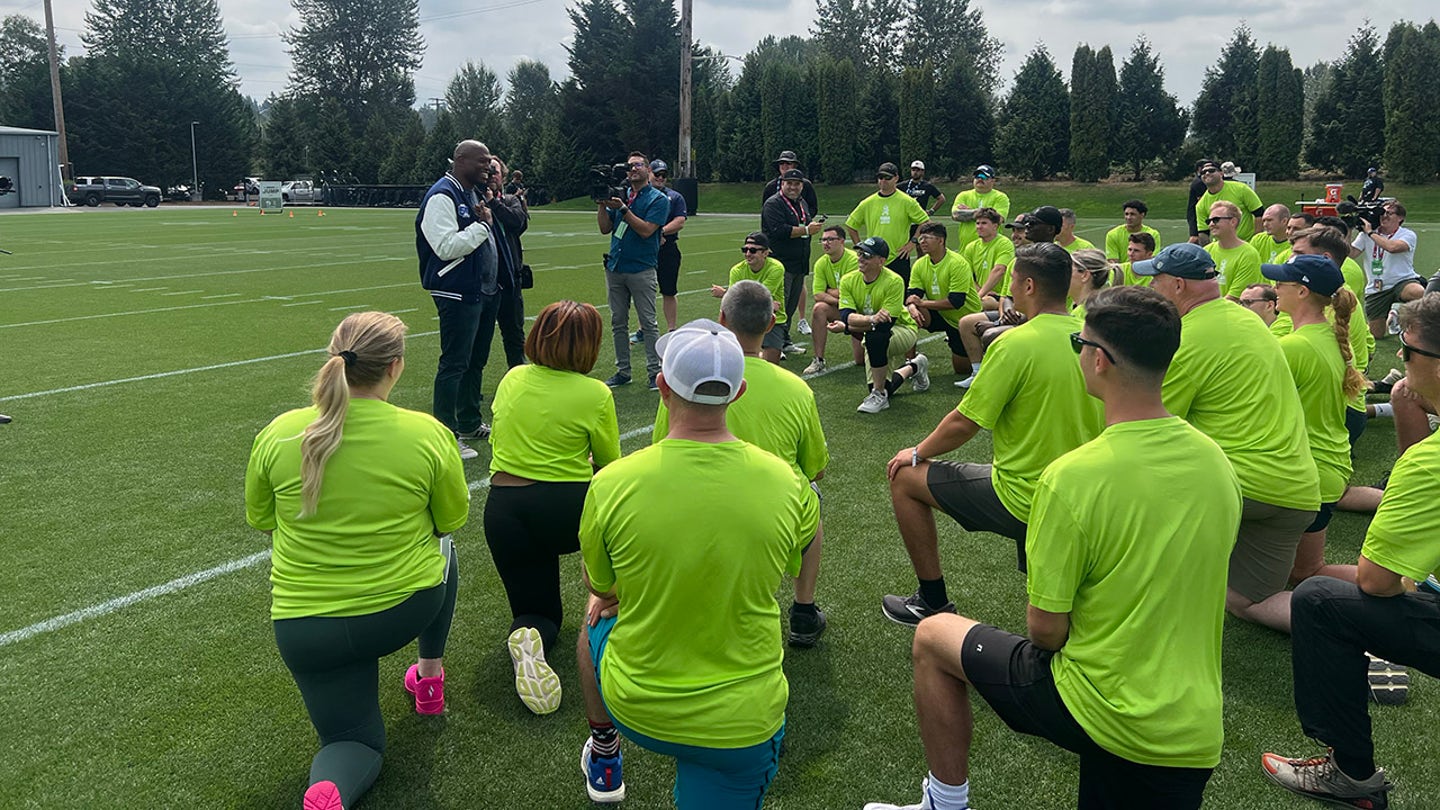 Seattle Seahawks -legend Shaun Alexander speaks to military service members on “Salute to Service NFL boot camp.” (USAA)