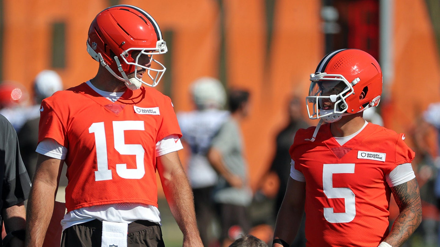 Cleveland Browns Quarterbacks Joe Flacco (15) and Dillon Gabriel (5) Chat during training camp July 23, 2025 in Berea. (Jeff Lange / USA Today Network via iMagn -Pictures)
