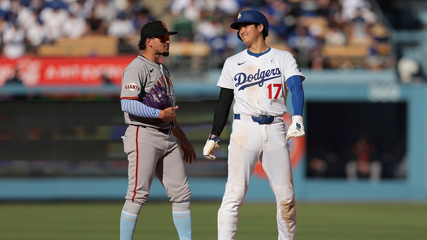 Los Angeles Dodgers appointed hitter Shohei Ohtani, #17, responds while interacting with San Francisco Giants Shortstop Willy Adames, #2, during the fifth round of a baseball game in Los Angeles on Sunday 15 June 2025. (AP Photo/Jessie Alcheh)