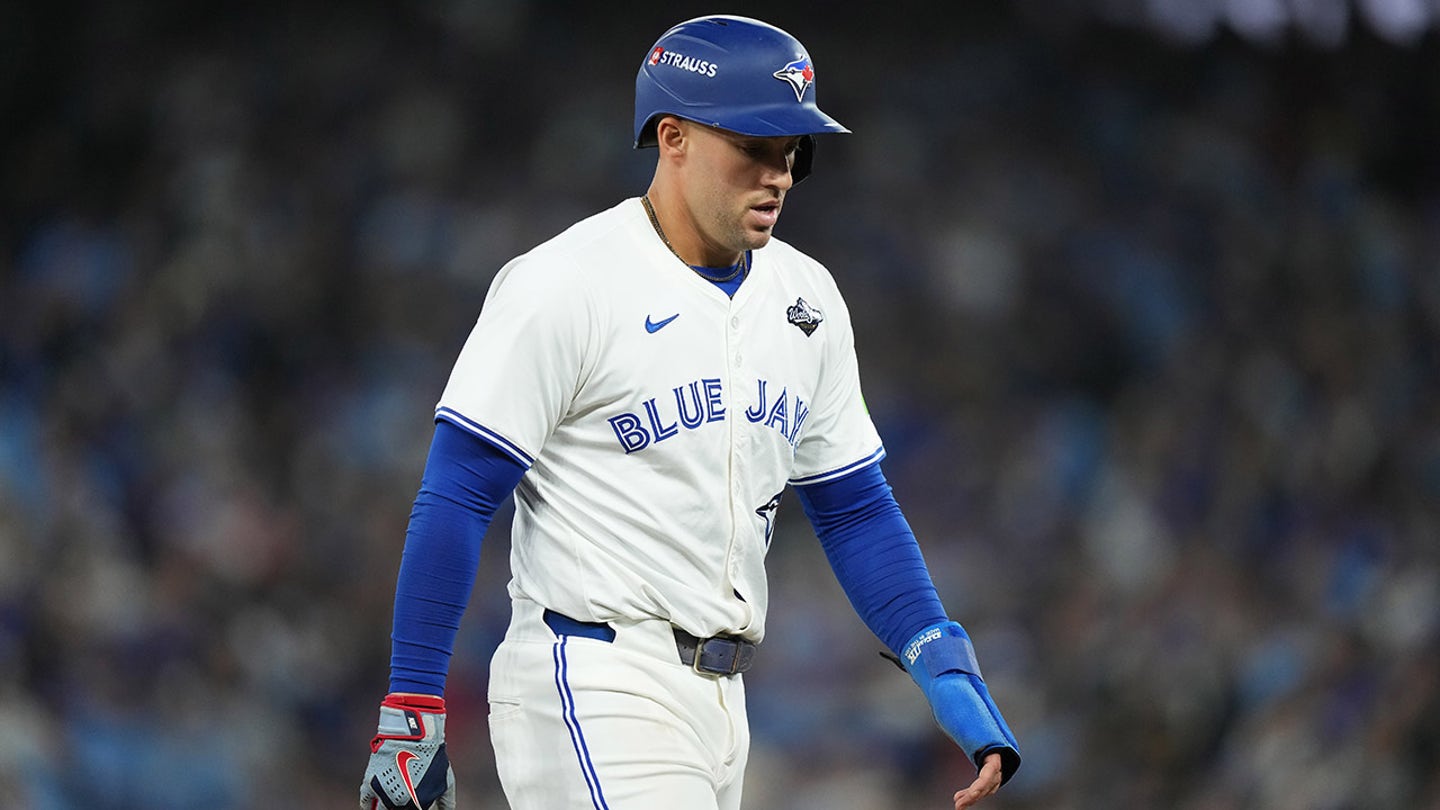 Toronto Blue Jays designated hitter George Springer (4) walks back to the dugout after being thrown out at second base to end the first inning against the Los Angeles Dodgers in Game 7 of baseball’s World Series in Toronto, Saturday, Nov. 1, 2025. (Nathan Denette/The Canadian Press via AP)