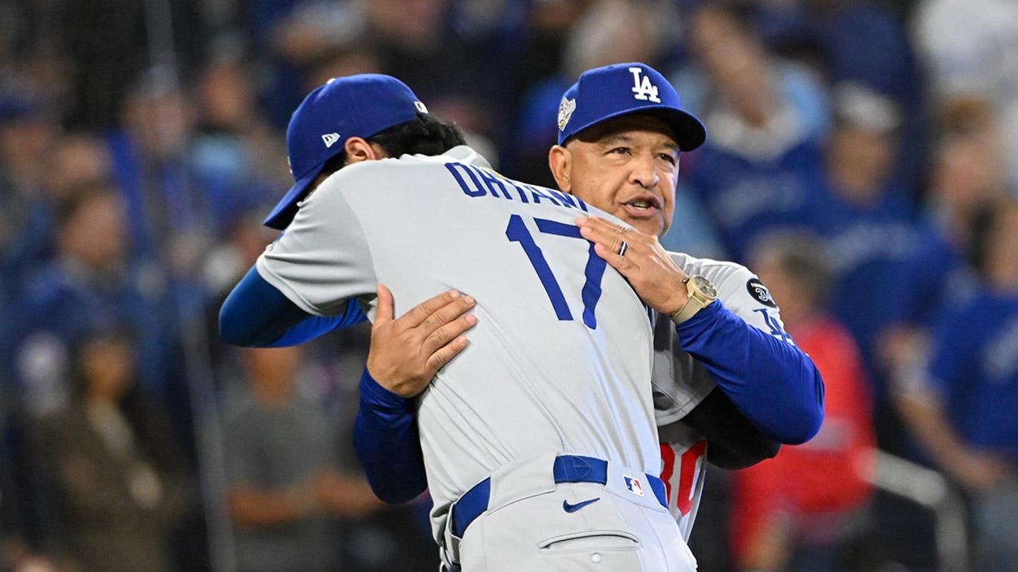 Los Angeles Dodgers pitcher Shohei Ohtani greets manager Dave Roberts during player introductions before Game 1 of the 2025 World Series against the Toronto Blue Jays at Rogers Center in Toronto, Ontario on October 24, 2025. (Dan Hamilton/Imagn Images)