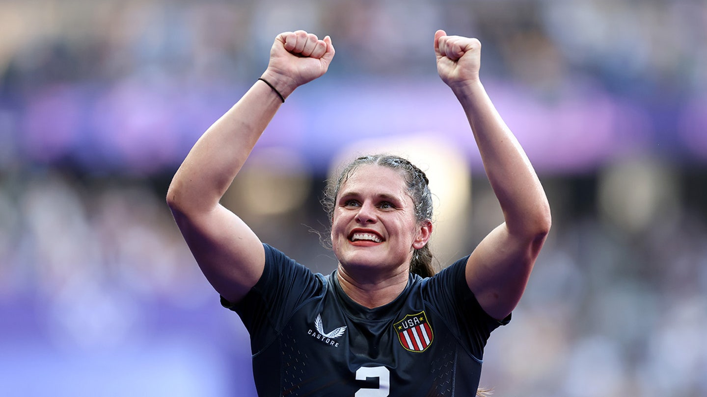 Ilona Maher #2 from Team United States celebrates after victory under Women’s Rugby Sevens Bronze -Medal -Fight between Team United States and Team Australia on day four of the Paris Olympic Games 2024 on Stade de France on July 30. 2024, in Paris, France. (Cameron Spencer/Getty Images)