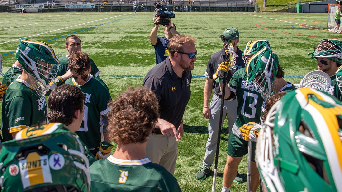 Siena men’s lacrosse coach Liam Gleason coaches his team. (Carlisle Stockton/Stockton Photo)
