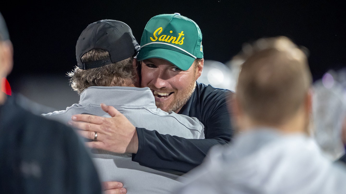 Siena men’s lacrosse coach Liam Gleason hugs a staff member. (Carlisle Stockton/Stockton Photo)