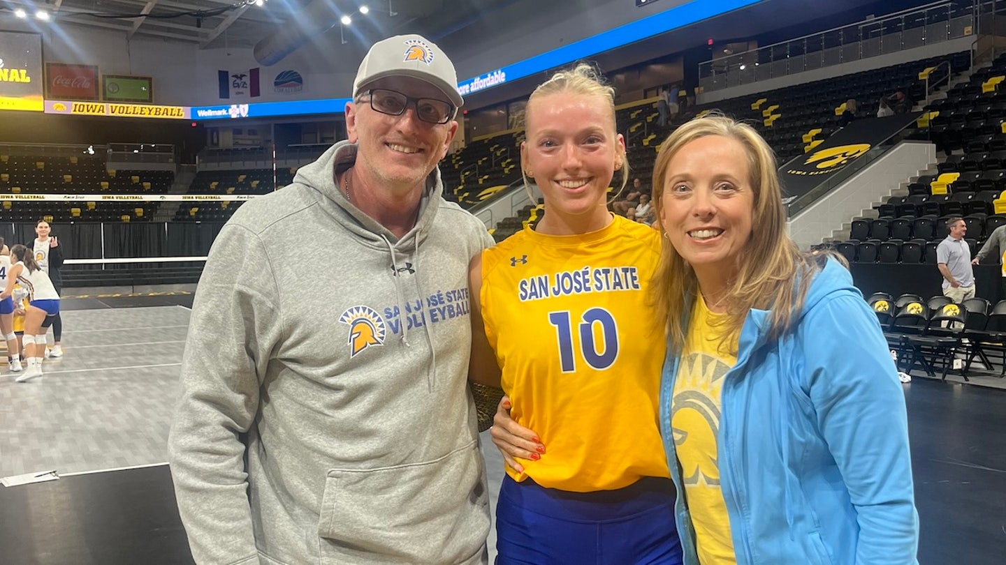 Former SJSU volleyball star Brooke Slusser and her parents Paul and Kim Slusser at a match on Sept. 8, which Kim claims is “the last good memory we have of her playing.” (Courtesy of Kim Slusser)