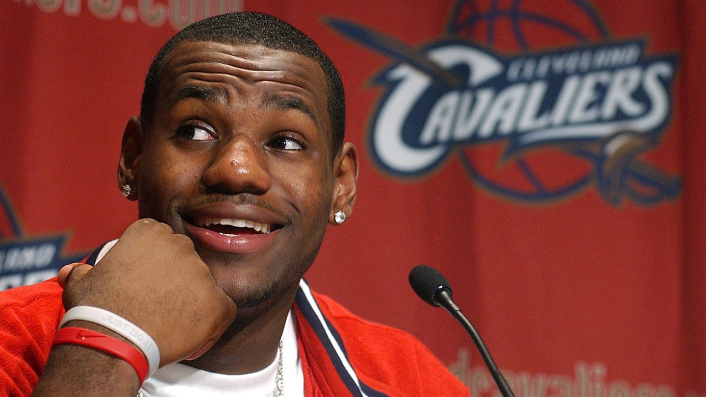 LeBron James answers questions from media members gathered in Gund Arena after he worked for former Cavalier’s head coach Paul Silas and the team on June 20, 2003. (Phil Masturzo/USA Today Network)