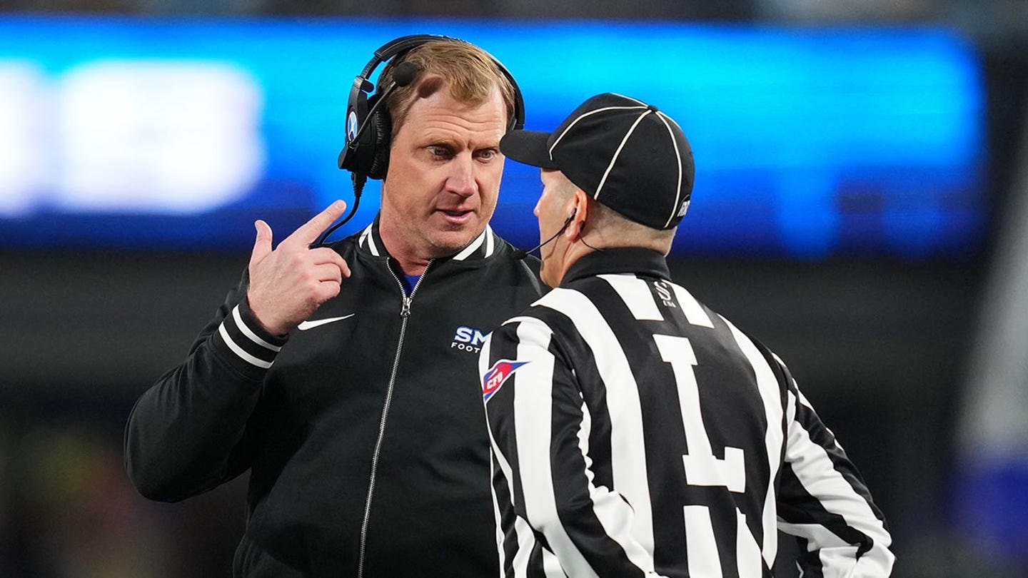 Main coach Rhett Lashlee from Smu Mustangs talks to an official in the first half of the 2024 ACC Football Championship at Bank of America Stadium on December 7, 2024 in Charlotte, North Carolina. (Grant Half -Person/Getty Images)
