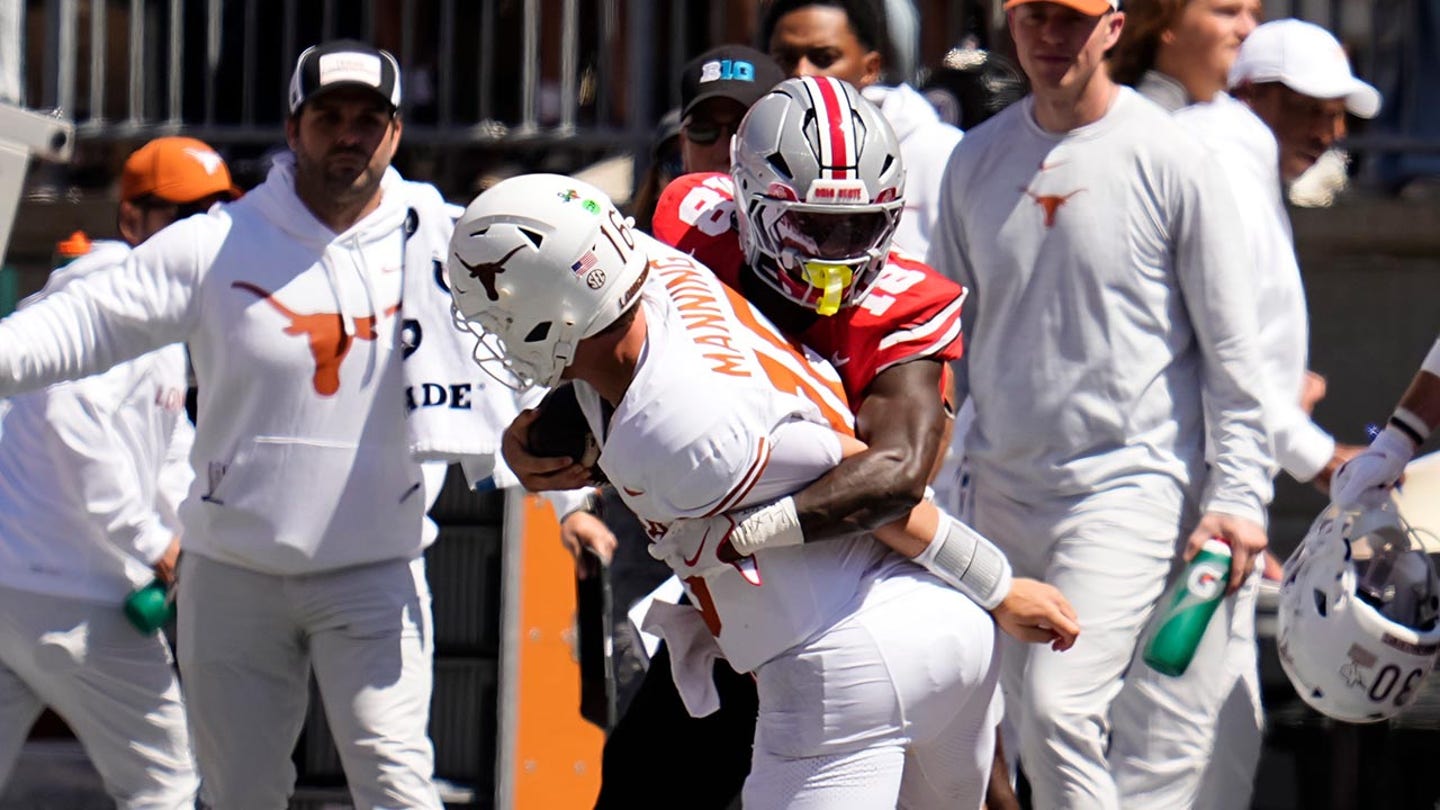 Ohio State Buckeyes Safety Jaylen McClain tackles Texas Longhorns Quarterback Arch Manning. (Adam Cairns / Columbus Dispatch / USA Today Network via Imag images)